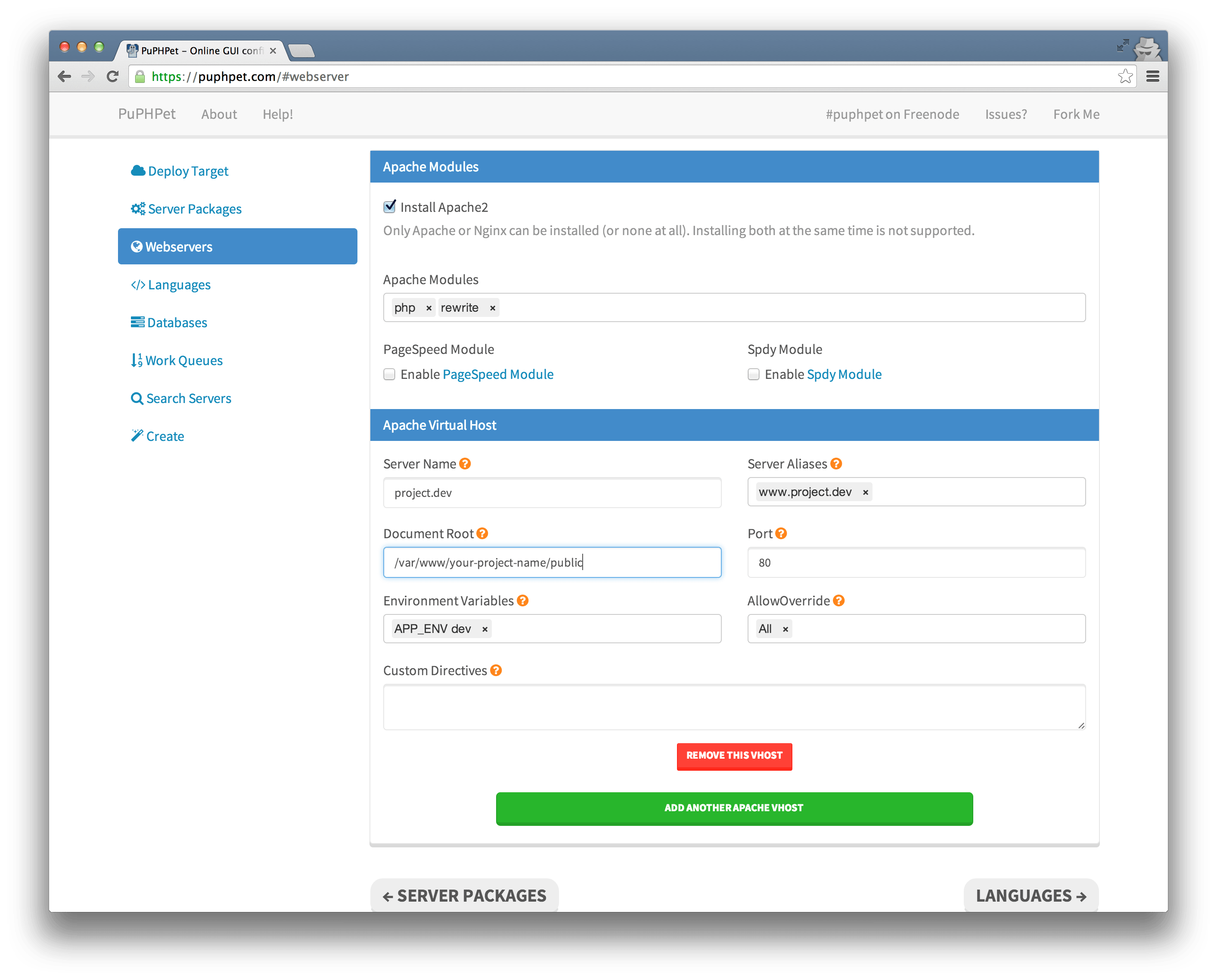 Set Server Nameto a URL you want to work with. Change Document Rootto /var/www/your-project-name/public.