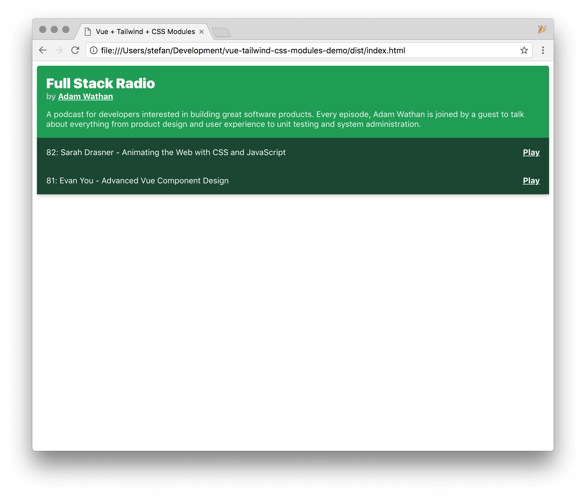 If you refresh your browser you should see the a Navbar and a Card styled by Bootstrap and your PodcastWidget styled by Tailwind.